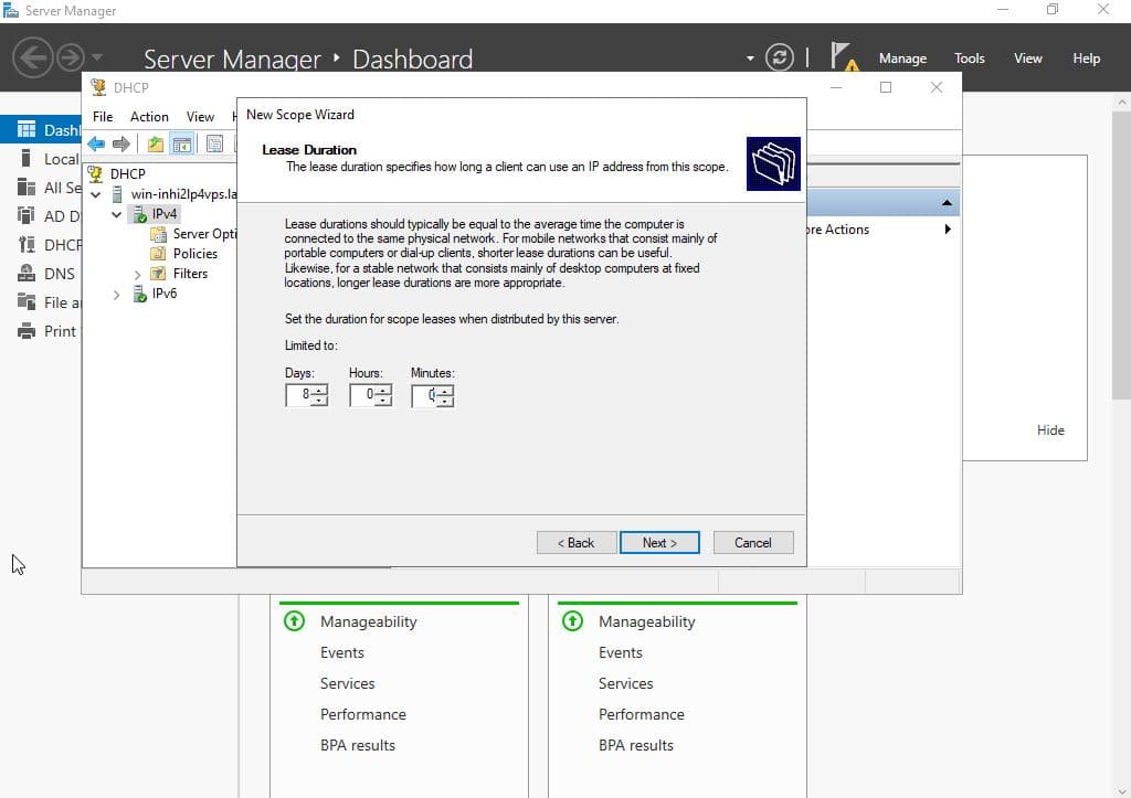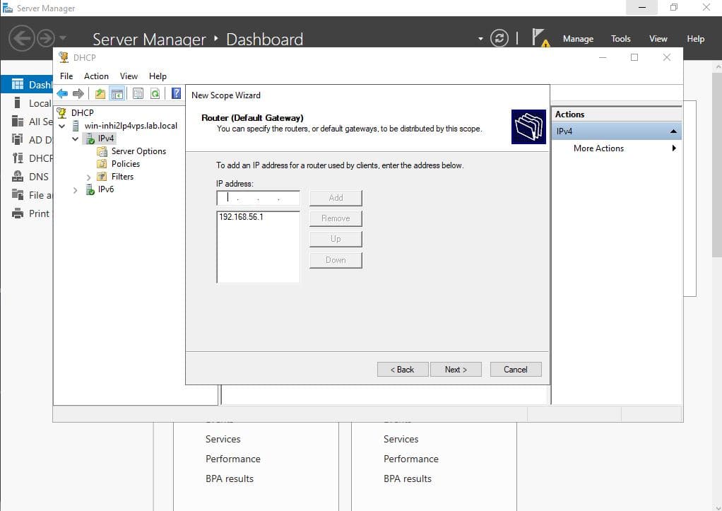 | Creating a DHCP IPv4 address scope with default gateway and DNS settings |