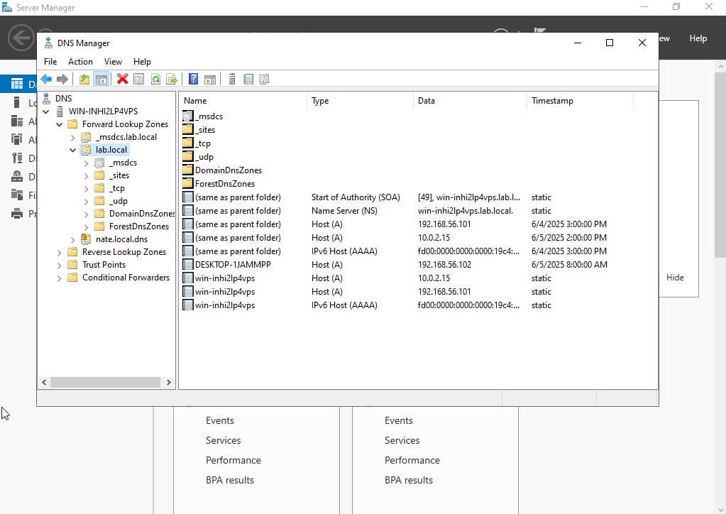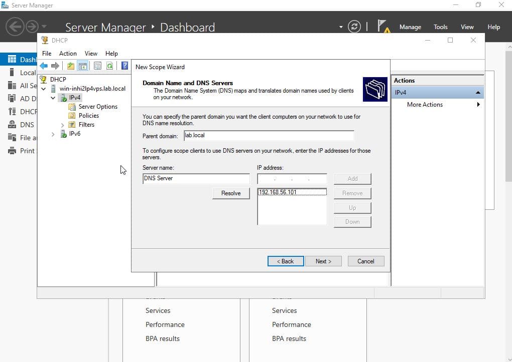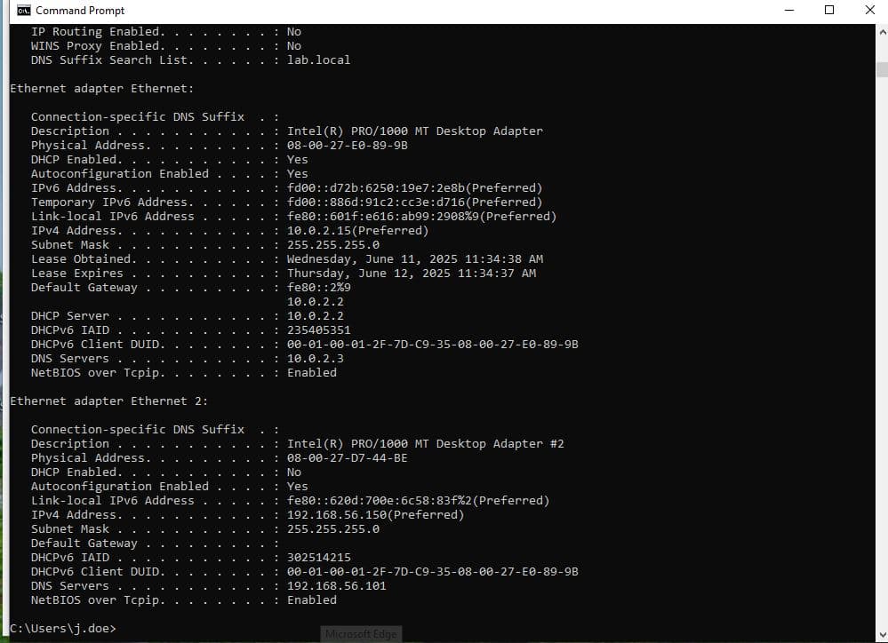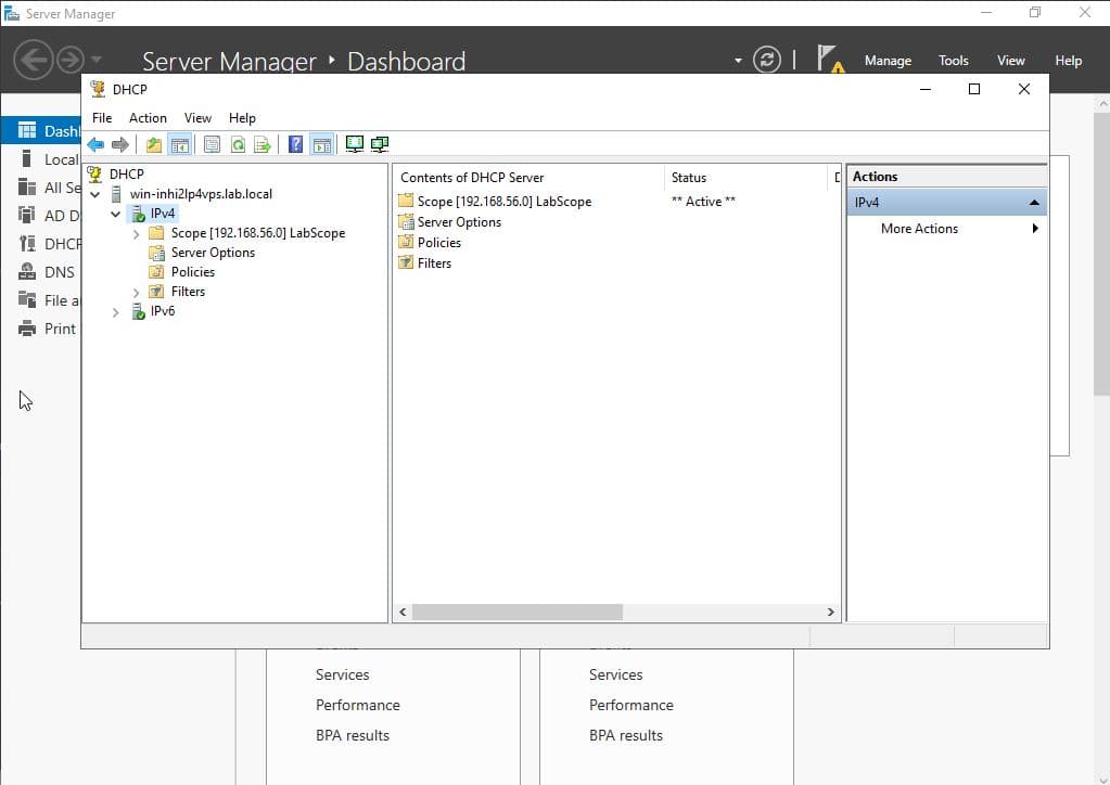 This lab demonstrates how to set up a fully functional DHCP and DNS environment within an Active Directory infrastructure using Windows Server. The process involves installing the DHCP and DNS Server roles, configuring a DHCP IPv4 scope to automatically assign IP addresses to client machines, and verifying domain resolution using DNS. A domain controller named lab.local is used to manage network resources, and a Windows client is configured to test IP lease and DNS resolution. This setup simulates a real-world enterprise environment where centralized network services are critical for device provisioning and name resolution.