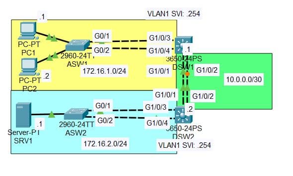To have both links be forwarding at the same time and increase potential bandwidth, I will be setting up Layer 2 EtherChannel configuration between the access layer switches (ASW) and the distribution layer switches (DSW), and Layer 3 EtherChannel configuration between the distribution layer switches.