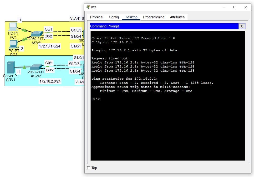 Now that the IP addresses are configured, PC1 can reach SRV1: