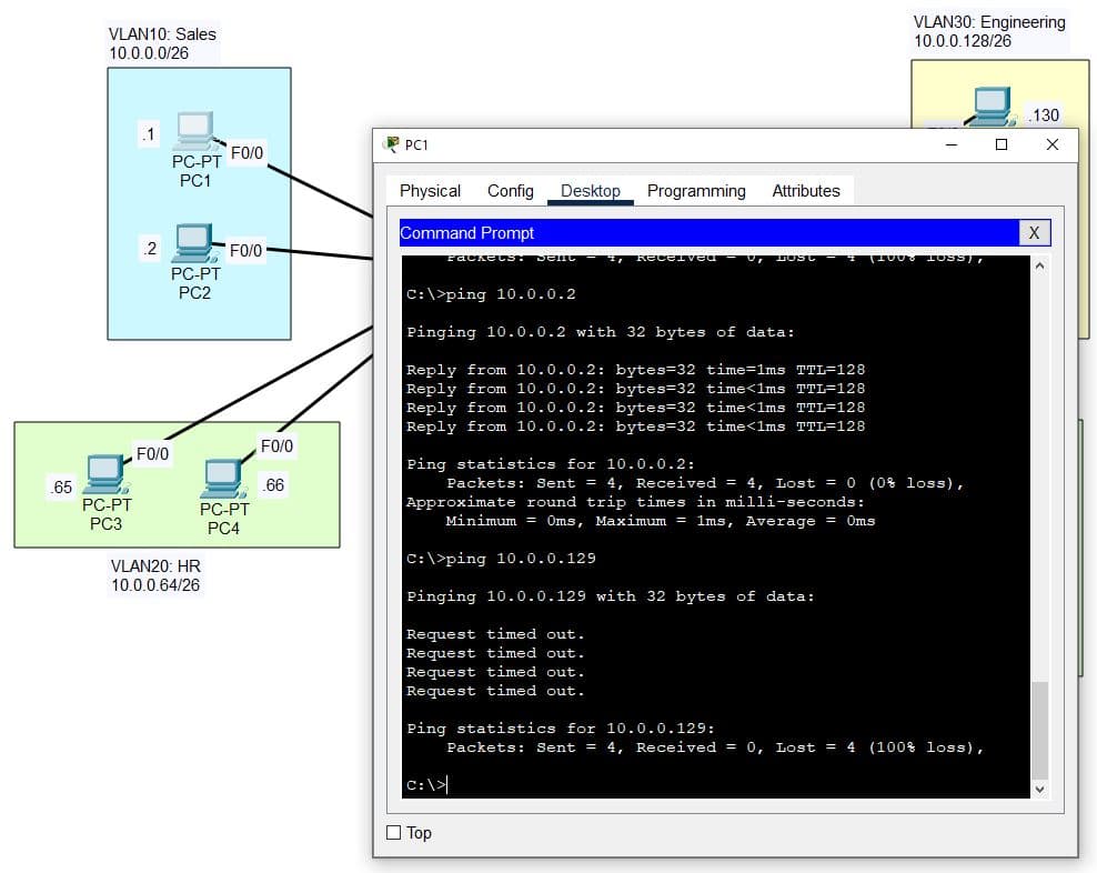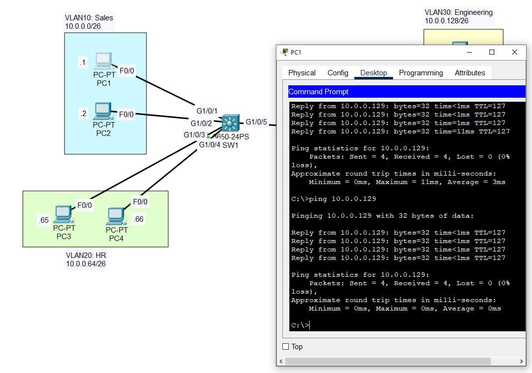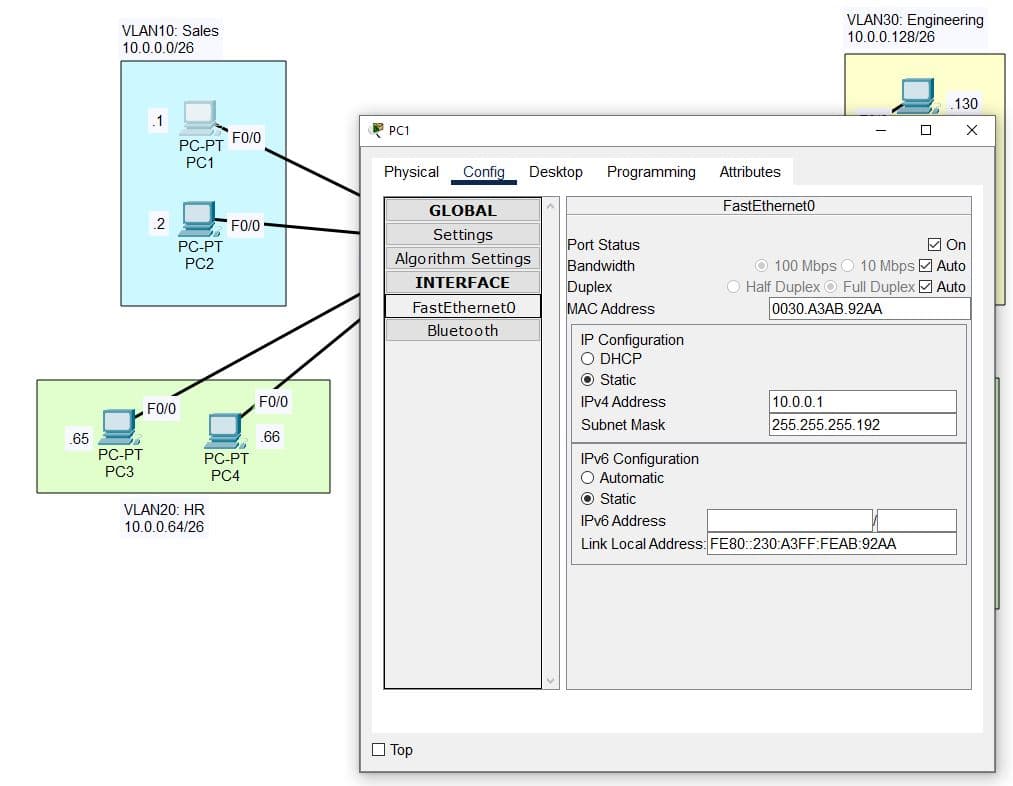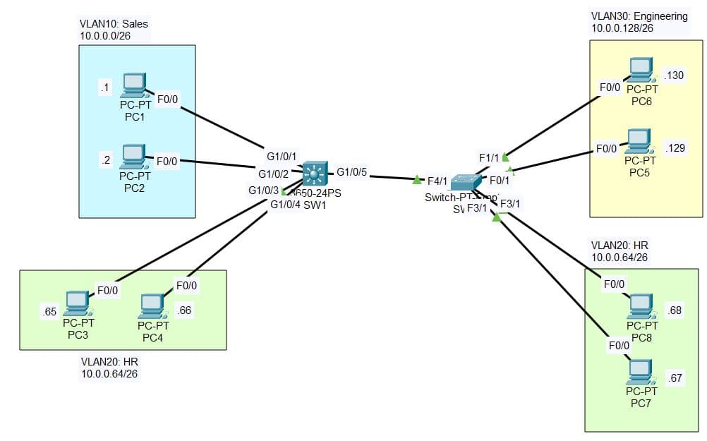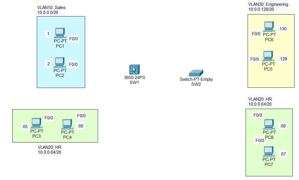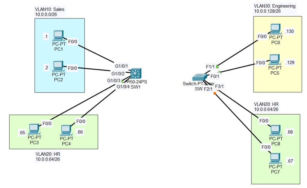 | Simulating a multi-department structure: Sales (VLAN10), HR (VLAN20), Engineering (VLAN30) |