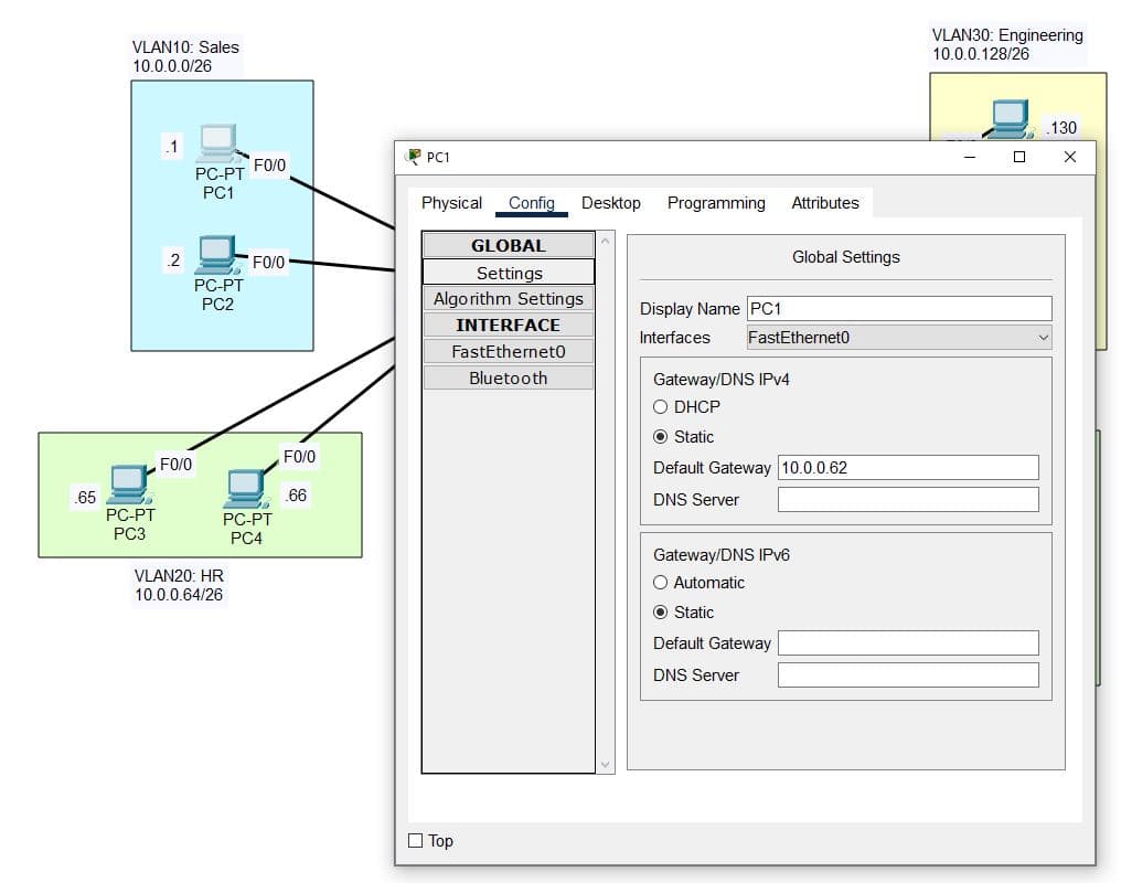 | PC1 | 10.0.0.1 | 255.255.255.192 | 10.0.0.62 |