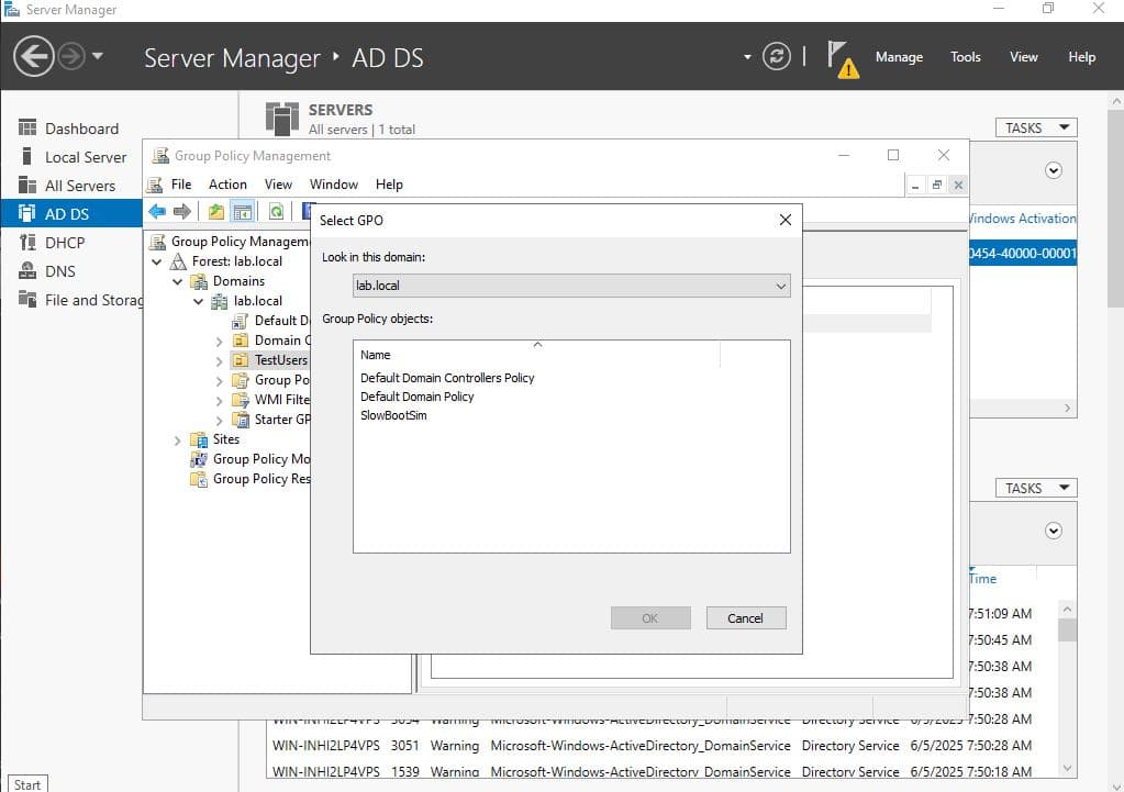 - Used "Link an Existing GPO" to attach the SlowBootSim GPO to the TestUsers OU