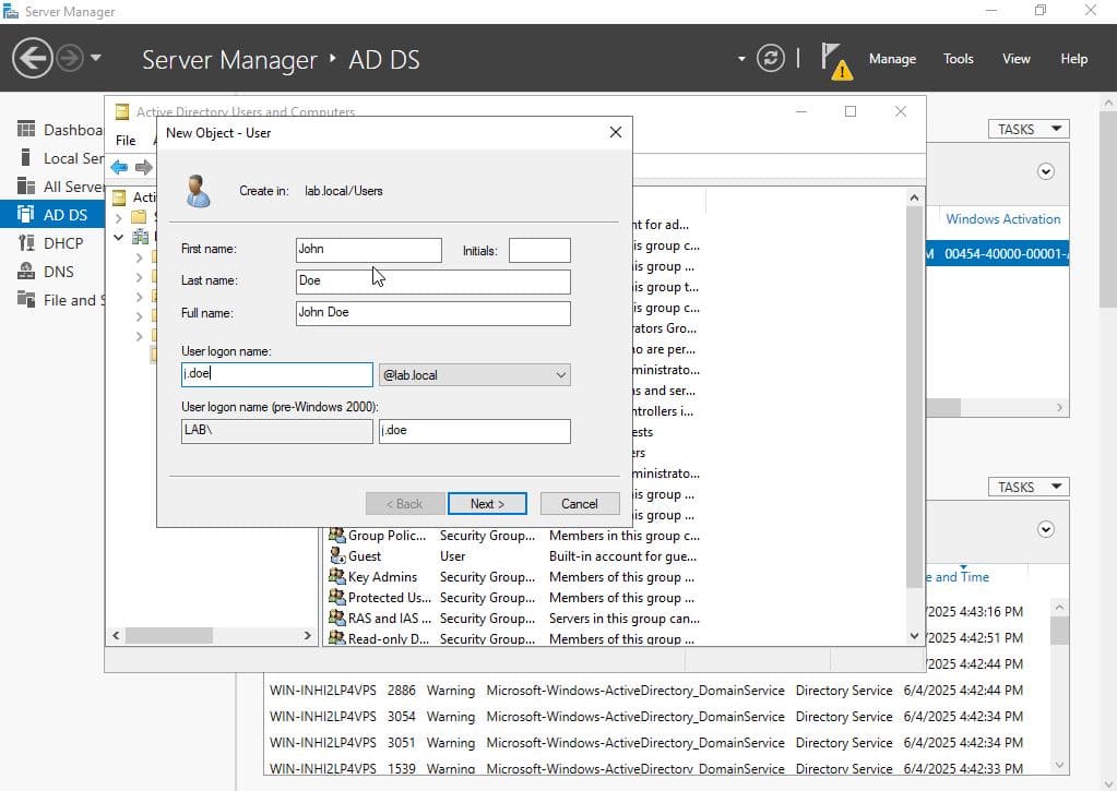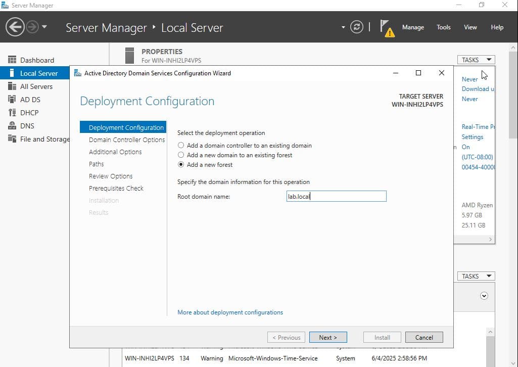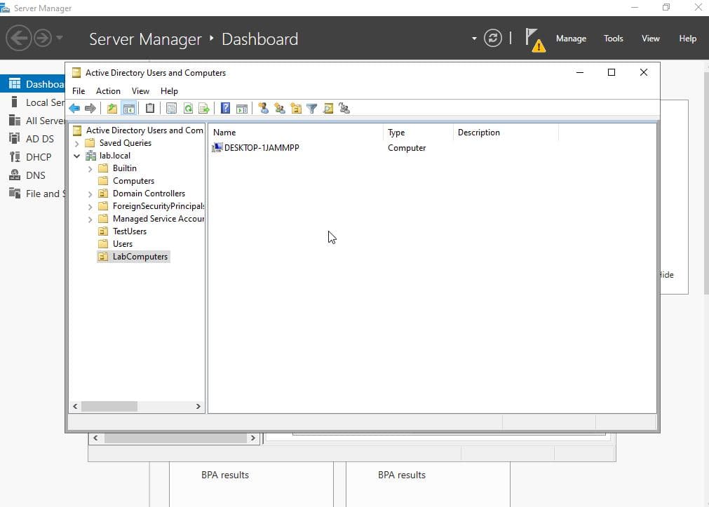 - Promoted the server to a Domain Controller with the domain name: lab.local