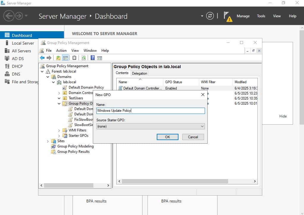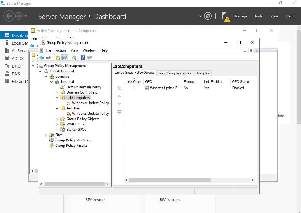 - In Group Policy Management, linked the Windows Update Policy GPO to the LabComputers OU
