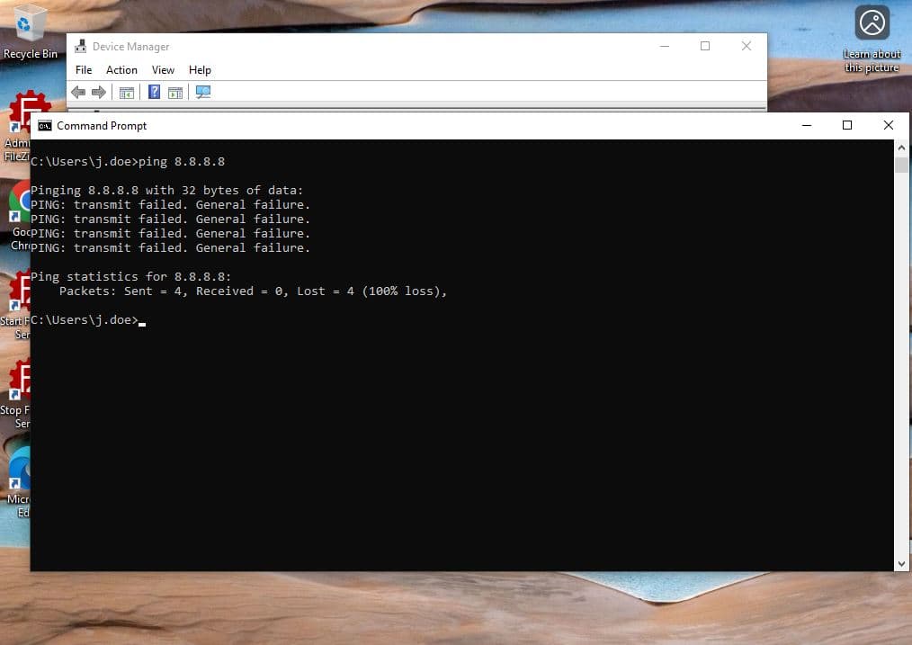 - Uninstalled Adapter 1 and confirmed loss of internet access by pinging 8.8.8.8