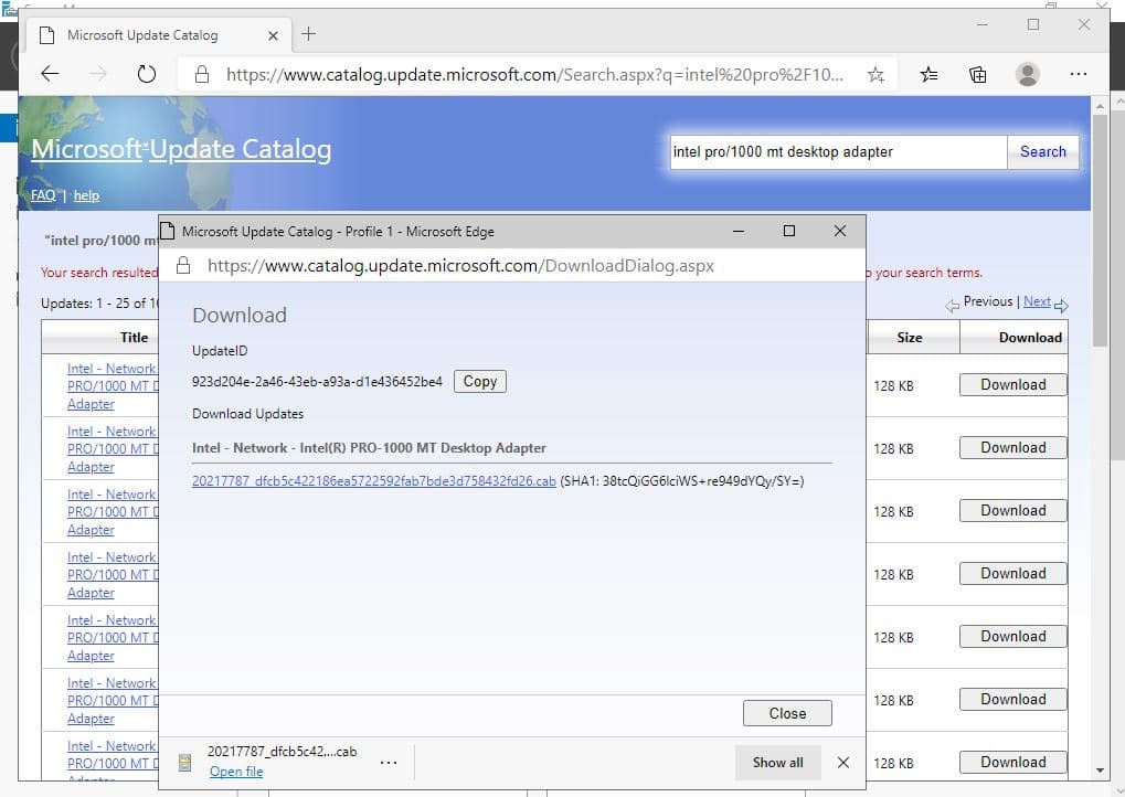- Searched and downloaded the Intel PRO/1000 MT Desktop Adapter .cabdriver package