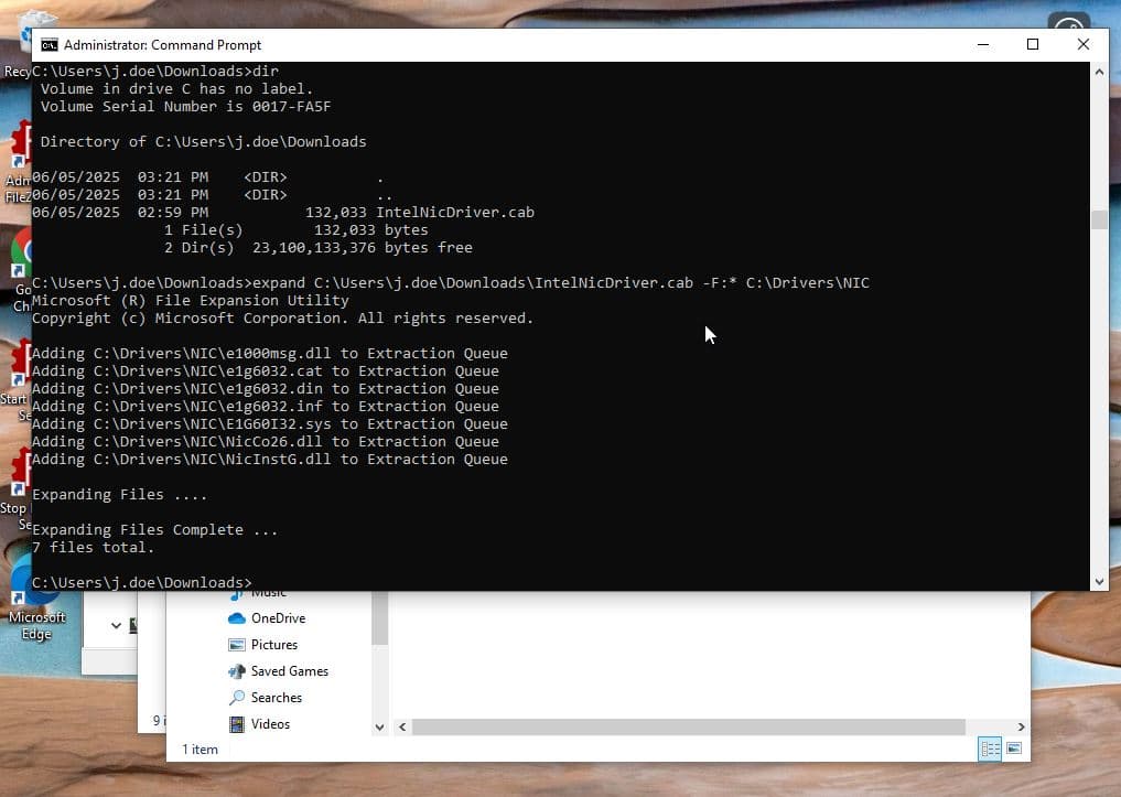 expand C:\Users\j.doe\Downloads\IntelNicDriver.cab -F:* C:\Drivers\NIC