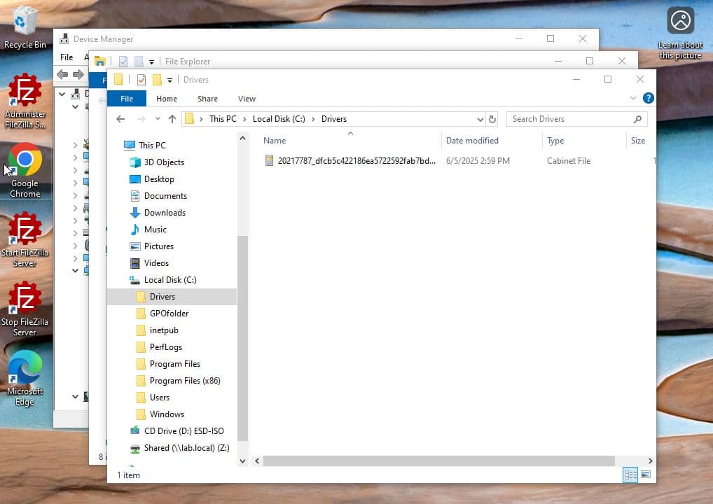 This lab simulates a network driver failure on a Windows 10 client and walks through the steps to recover the missing driver by downloading it on the server, sharing it over the network, and reinstalling it manually on the client.