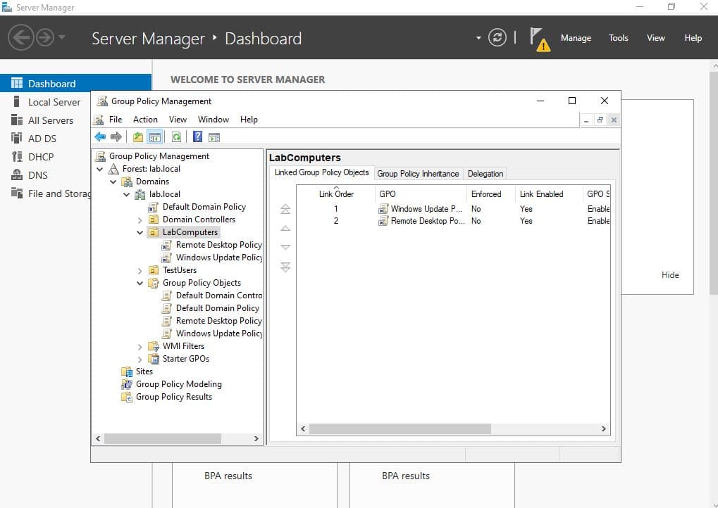 - Linked the Remote Desktop Policy GPO to the LabComputers OU